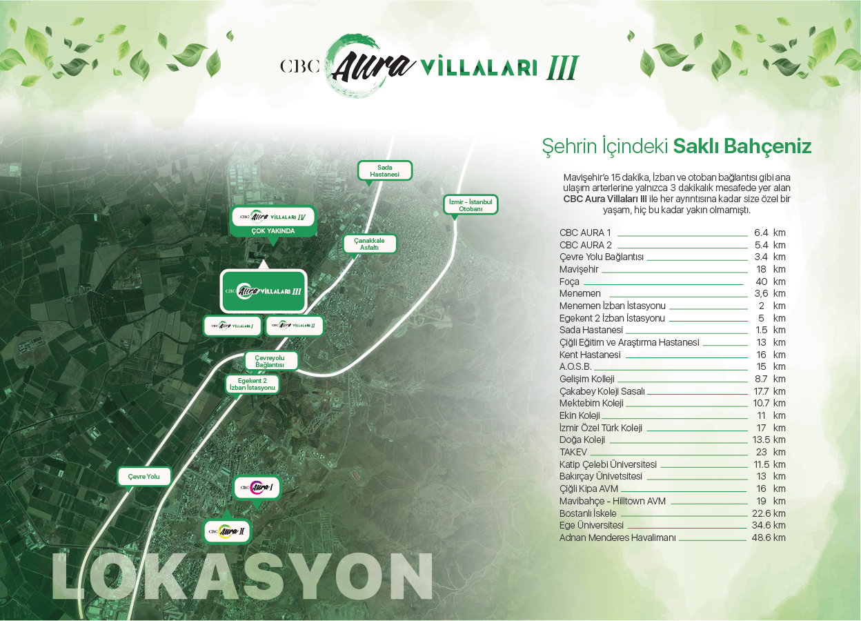 Mavişehir’e 15 dakika, İzban ve otoban bağlantısı gibi ana ulaşım arterlerine 3 dakikalık mesafede yer alan CBC Aura Villaları 3 ile her ayrıntısına kadar size özel bir yaşam, hiç bu kadar yakın olmamıştı.